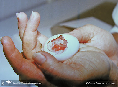 La température doit rester constante, presqu'au 10ème de degré près, vers 37,1 ou 2 ainsi que le taux d'humidité. La seule chose qui manque à ces embryons est l'énergie corporelle transmise par la mère à travers la coquille. Ayant observé ce phénomène à maintes reprises (difficultés pour le petit de sortir de sa coquille) nous avons opté pour une solution plus naturelle: l'incubation par les poules naines "nègres-soies", très bonnes couveuses. Mais nous ne leur avons confié que les plus gros œufs, à savoir ceux des grands Aras et des grands Cacatoès. Toutefois, nous devions les retirer 3 jours avant l'éclosion et les mettre dans les incubateurs pour l'éclosion, les poules n'auraient pas su quoi en faire!