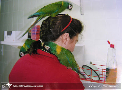 Dès qu'ils étaient en âge de supporter la température ambiante et que les plumes commençaient à remplacer le duvet, ils étaient mis dans des cages suspendues au mur avec un perchoir et qui pouvaient être sorties par beau temps. Inutile de dire que toutes les portes étaient ouvertes et qu'ils pouvaient se retrouver et venir sur nos épaules et sur notre tête, réclamer aussi... des câlins! Ceci plusieurs fois par jour bien sûr! Autant la "récré" pour moi que pour eux!