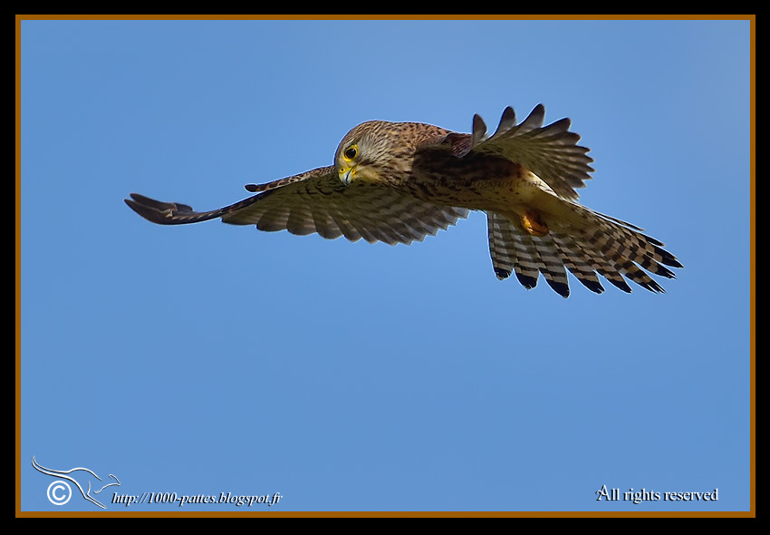 As other birds of prey, these elegant kestrels have a perfectly bounded territory which consists of open fields and fallow lands along wood edges above which they hover to hunt their prey consisting of large insects, lizards, field mouses and small batrachians among others.
