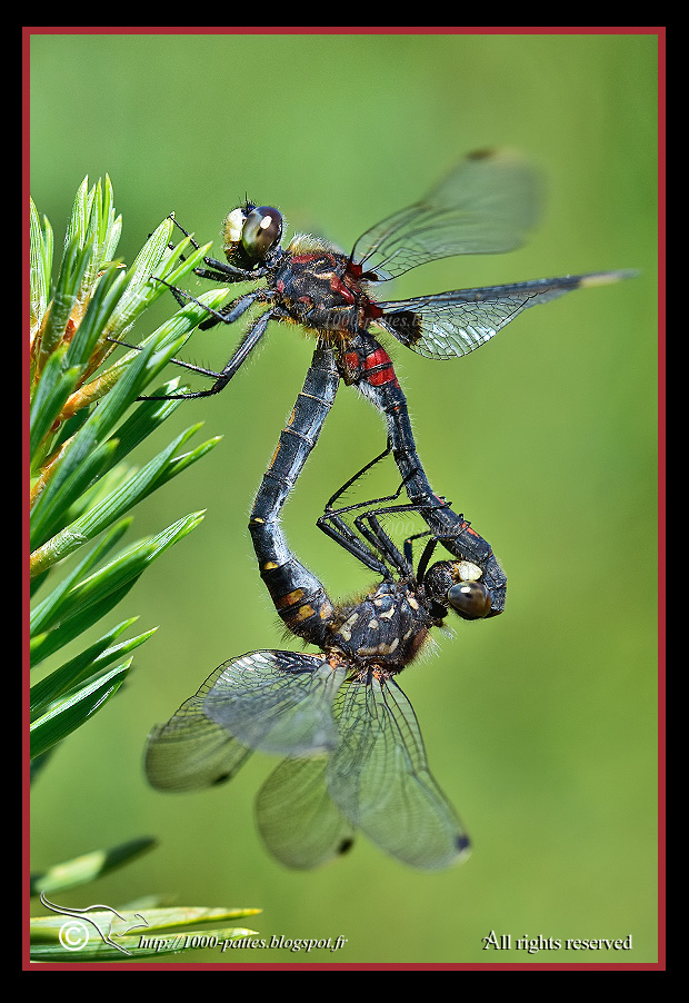 Et voici la deuxième espèce que nous venons chercher dans ces tourbières d'altitude, la Leucorrhine douteuse. Ma première rencontre est cet imbroglio de 3 mâles accrochés en mal de dames... les femelles étant peu nombreuses sur le site à cet instant la frénésie gagne la gente masculine!