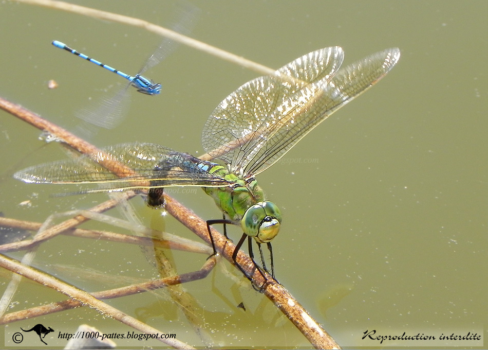 As soon as the sun warms up the atmosphere, several females twirl around to come and lay in the decaying vegetation along the lake banks and the rush tussocks allow for a discreet approach: