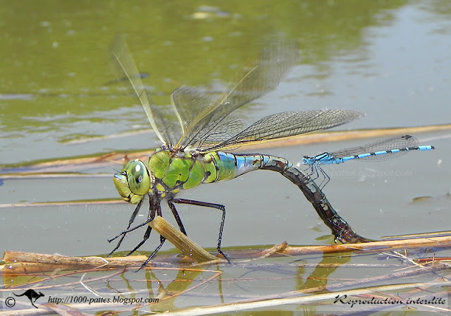 Larvae of large dragonfly species molt good about ten times or more, before creeping out of the water in spring when weather conditions are favorable. They emerge then to become a fully fledged winged imago. If the conditions are not gathered (too low atmospheric pressure, important rains, etc.), they can return to the water to postpone their emergence.