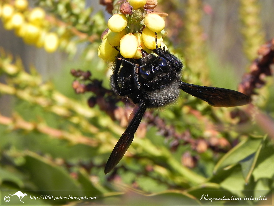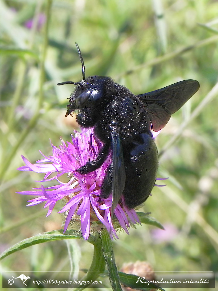 Je suis toujours attirée par ces gros hyménoptères, leurs ailes violettes sont si belles! Et la photo est un vrai challenge, l'insecte étant si sombre!