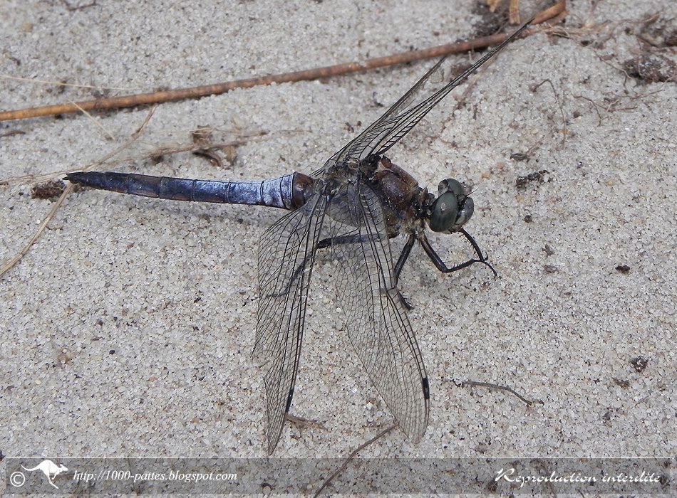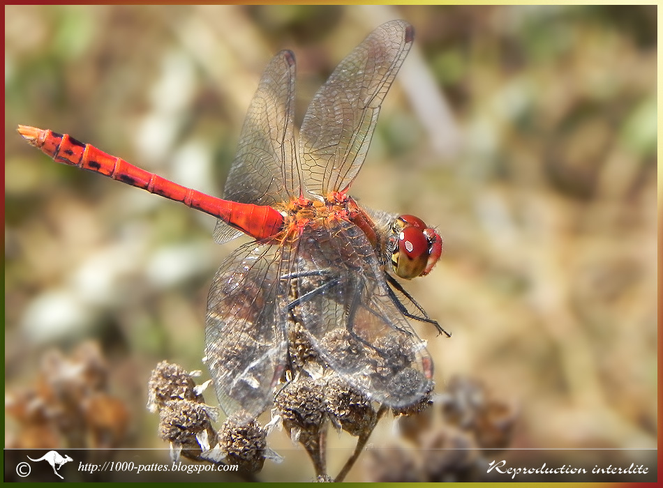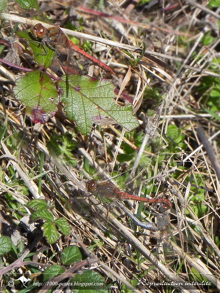 Males are more territorial than other Darters. They also spend more time on the wing than on their favourite perch. The male could be easily be confued with the male Crocothemis: both are red and have the under part of their eyes bluish-grey. It is visible all over France but is much more present in southern half. It is a strong migrant dragonfly and is seen flying as other darters emerge... In fact, it might not be part of the Sympetrum family, according to genetic studies (" Guide of the Dragonflies of France and Europe ")... This said, I wonder about this information having photographed on 2 separate occasions "aberration" couples striolatum/fonscolombii, which you can see on my banner and at the link above.