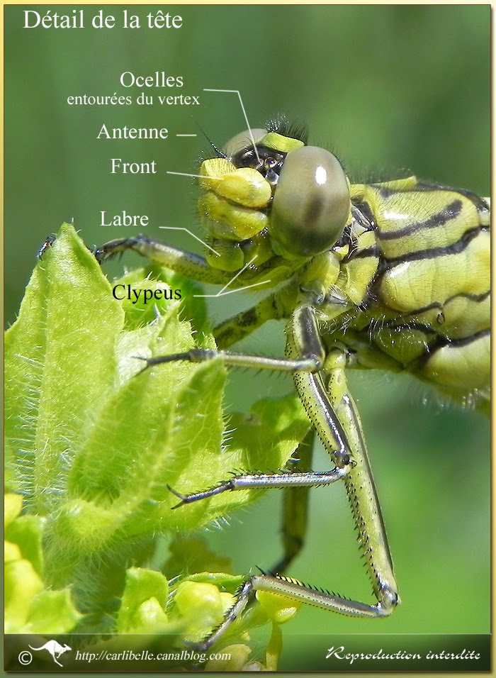 La libellule commence en craquant son exuvie par le dos et se bascule à l'envers; lorsqu'il est presque entièrement sorti, il se redresse d'un mouvement brusque et s'y raccroche avec ses pattes: elle va lui servir de support pendants les quelques heures nécessaires à son expansion et à son séchage. Son aspect verdâtre est dû à la couleur de son sang ou hémolymphe pompée dans le corps.