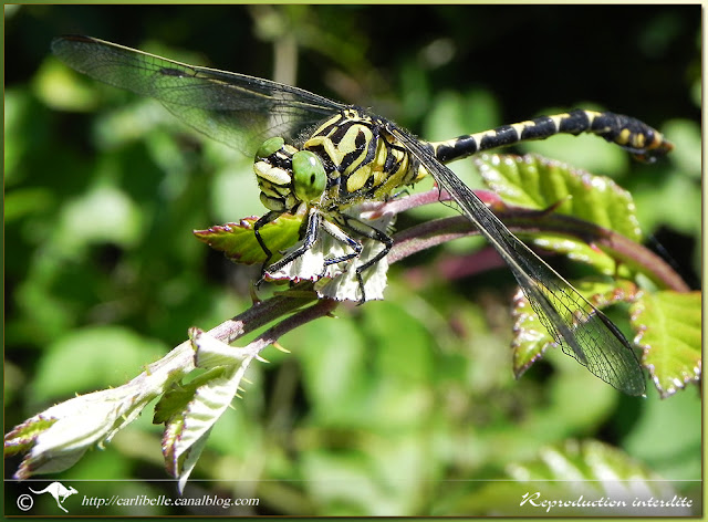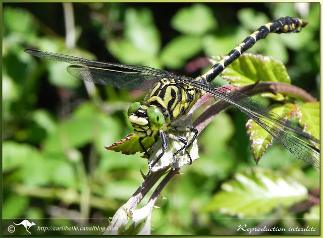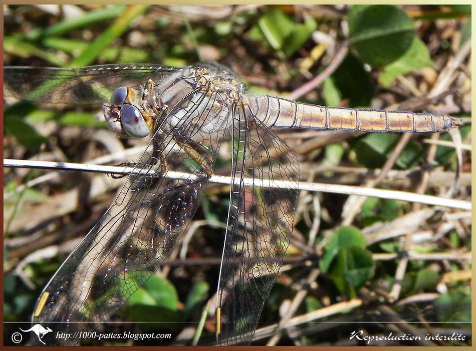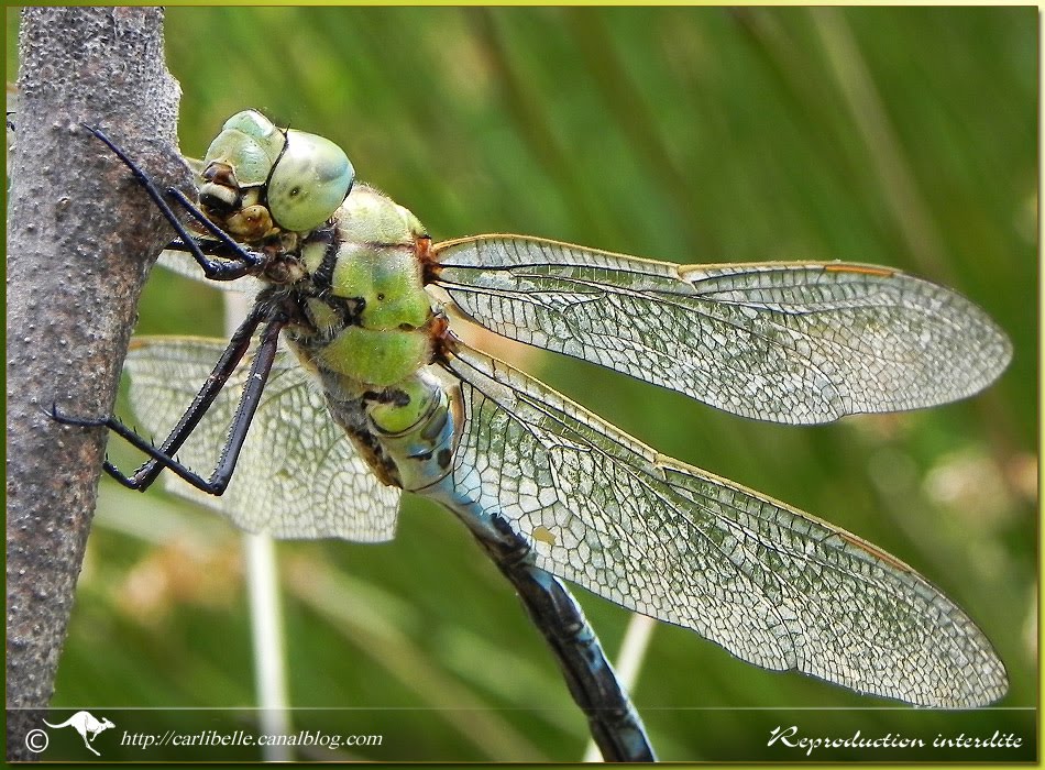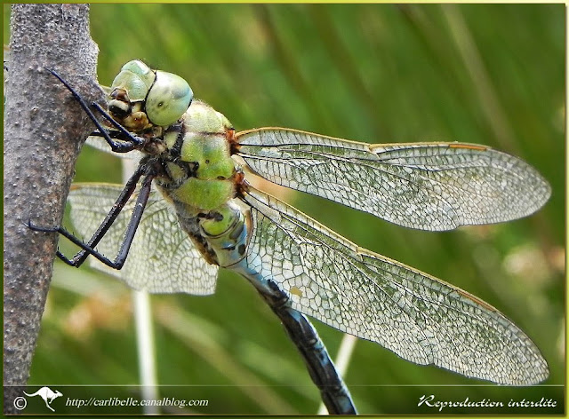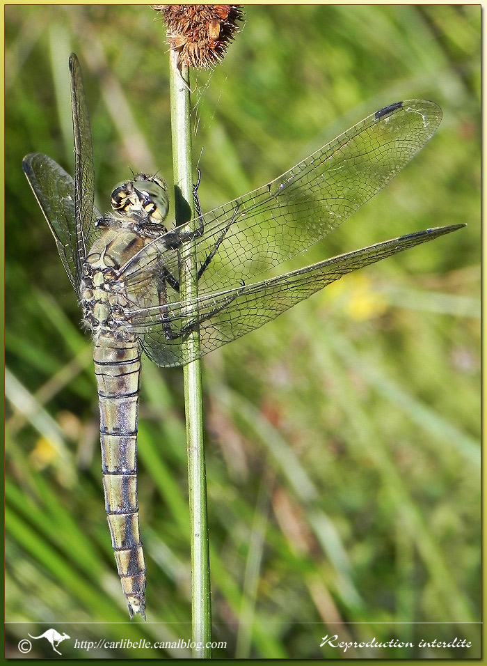 Orthétrum réticulé en "coeur copulatoire", suspendu à une branche de saule: