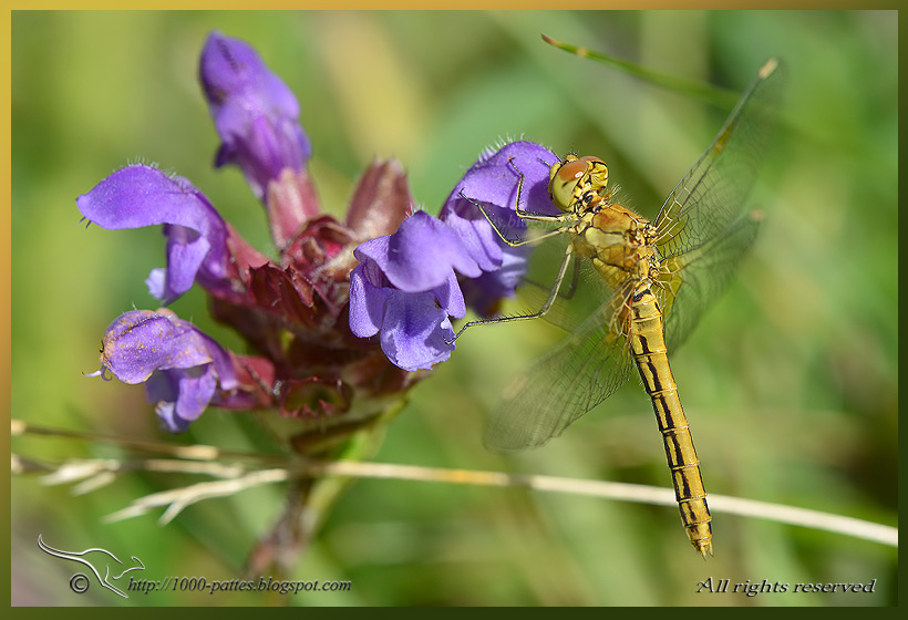 Sympêtre jaune tombé à l'eau, libellule qui se