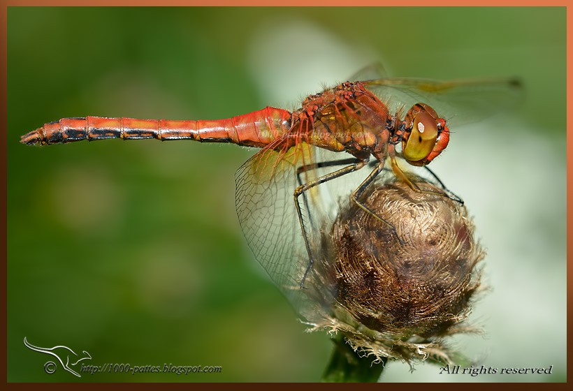 En y regardant de plus près, on peut également observer 3 points rouges sous l'aile postérieure gauche: ce sont les parasites condamnés à mort depuis la noyade de leur hôte et qui vivaient de sa lymphe (sang) lors de son vivant. D'ailleurs on peut en voir un 4è 'en détresse' qui s'en est détaché, sur la tige en bas à gauche!