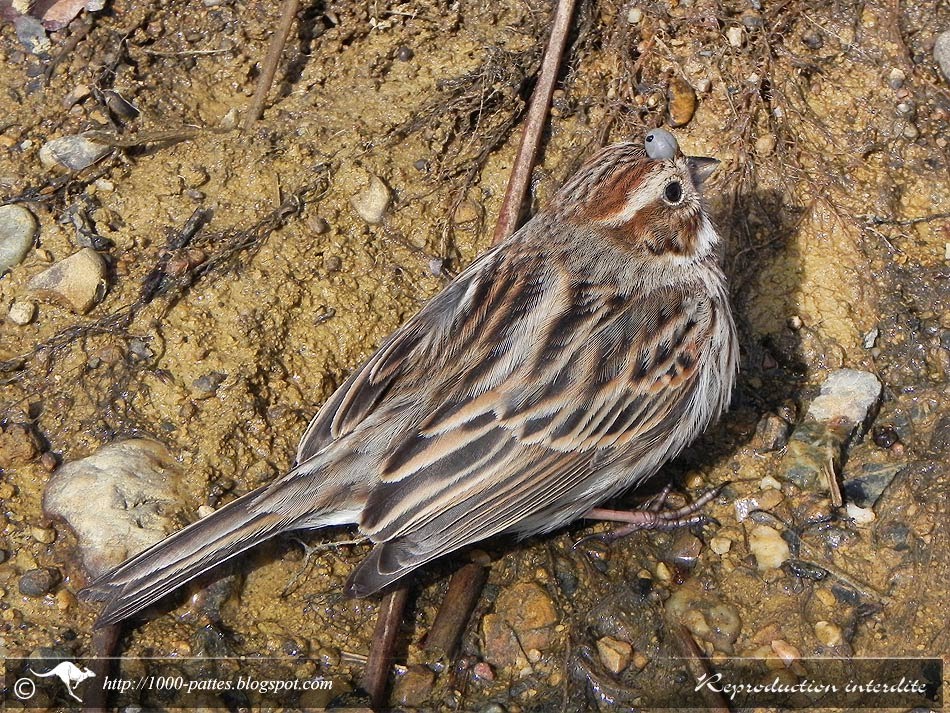 Une malheureuse femelle Bruant des roseaux avec une énorme tique sur le sommet de la tête. Je suis parvenue à la retirer, non sans difficulté! Ses joues sont bien marquées, ses plumes sont bordées de blanc et sa queue est plus longue que celle de l'Alouette lulu. Ces oiseaux se tiennent en grands groupes l'hiver et fréquentent les champs cultivés, prairies, alpages, landes. On dit qu'elle grisolle, tirelire ou turlutte quand elle chante, au sol, de façon très mélodieuse parfois pendant plus d’une heure.