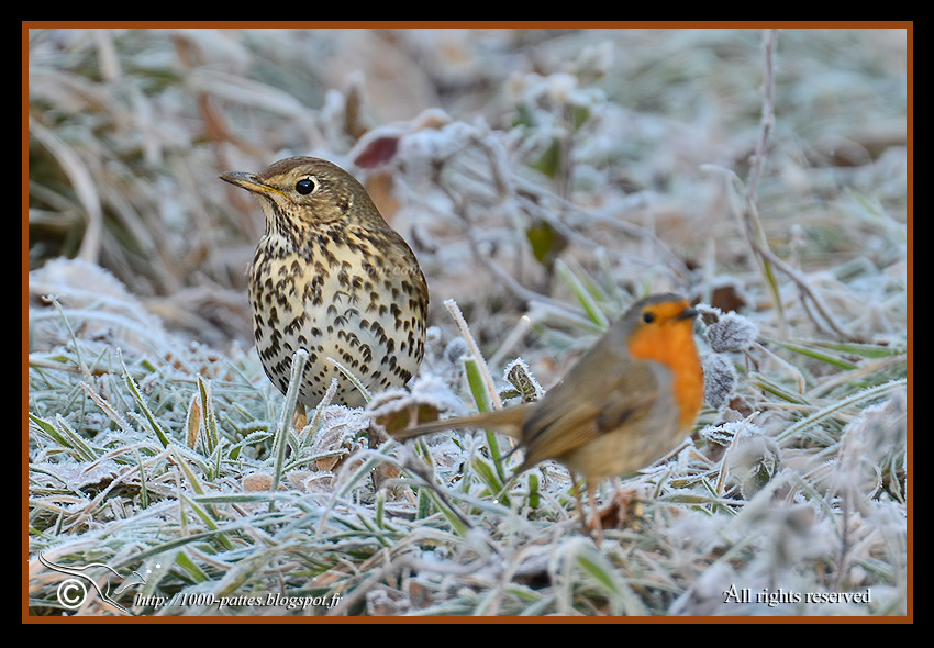 I see it often in the company of other birds, here under with its friend the Robin as the first sun rays hit the frozen grass: